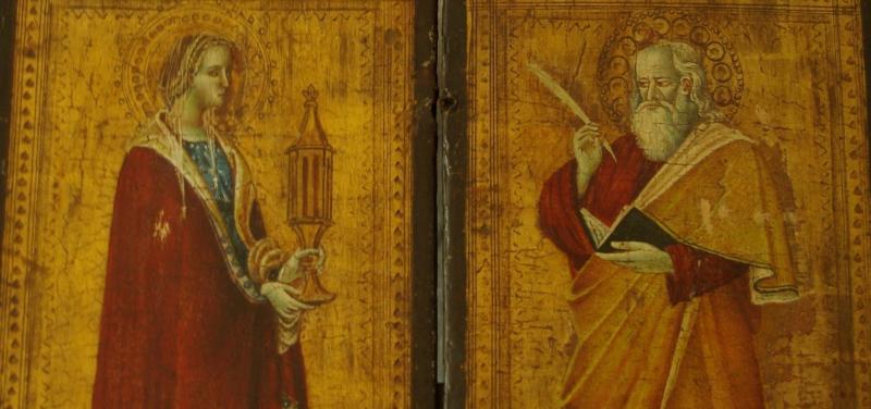 Bits of newspaper sticking to the male saint panel.