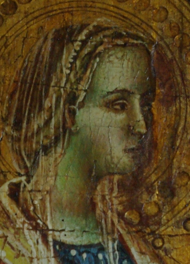 As well as "feather and book" area of the male saint panel.